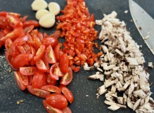 - Add the garlic, tomatoes, mushrooms, spinach, pepper and basil. Saute 5 minutes.