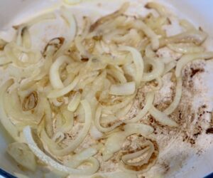 I like to use Vidalia or sweet onions, but a plain old yellow onion will work just as well. Red will work just fine, but I can’t recommend green. You can dice the onion if you want, but I don’t mind eating actual pieces of onion and it saves prep time, so I just slice them for this recipe.